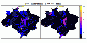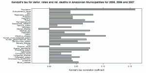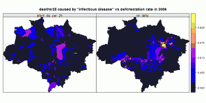 This tutorial reads the pixel based deforestation data for the Amazon region and computes the area weighted deforestation per municipality. This data is linked with data provided by IBGE reporting the number of deaths for a set of given reasons for several years. To avoid distortions of these numbers due to the different population sizes, the population weighted average is calculated and used to compute correlation values.