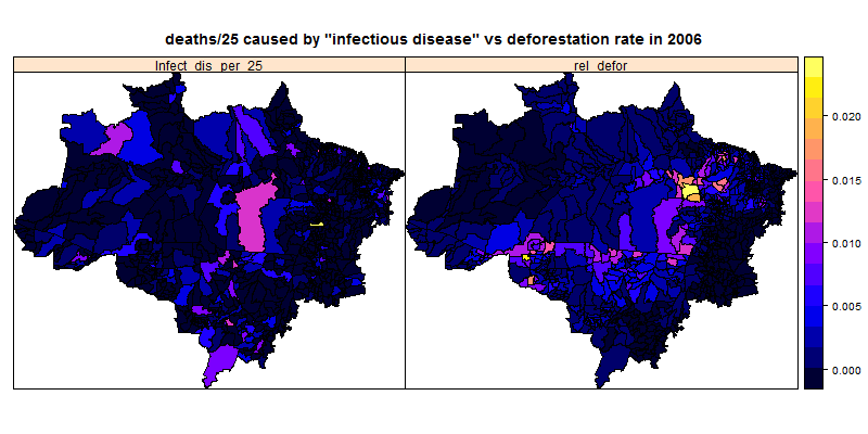 spplot(subAmazon[,2],c("Infect_dis_per_25","rel_defor"),col.regions=bpy.colors(), main="deaths/25 caused by \"infectious disease\" vs deforestation rate in 2006")