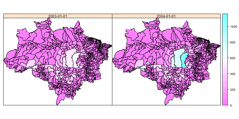 amazon@sp <- SpatialPolygonsDataFrame(amazon@sp, muniDefor[1:3])