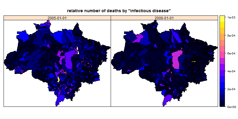 stplot(subAmazon[,1:2,"rel_Infect_dis"],col.regions=bpy.colors(), main="relative number of deaths by \"infectious disease\"")