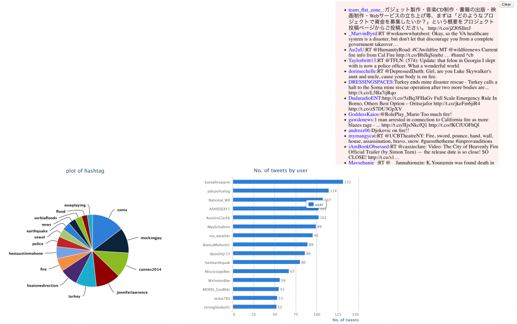 This will start streaming data relevant to our keywords (‘flood’, ‘fire’, ‘police’, ‘disaster’, ‘earthquake’, ’emergency’, ‘tornado’) from Twitter and enter into Solr. The fields that are stored in Solr are ID, user, creation date, location, source, content, mentions and hashtags.